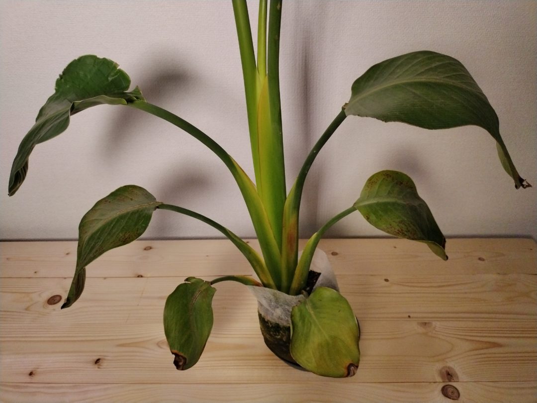 バショウ科は、横倒しにして栽培しても、樹木のように幹が弧を描いて成長することはありませんでした。そもそもバショウ科に幹は存在しません。曲がるのは、葉と根の接続部分が「くの字」に曲がるだけでしたので、通常通り、垂直に生育させます。