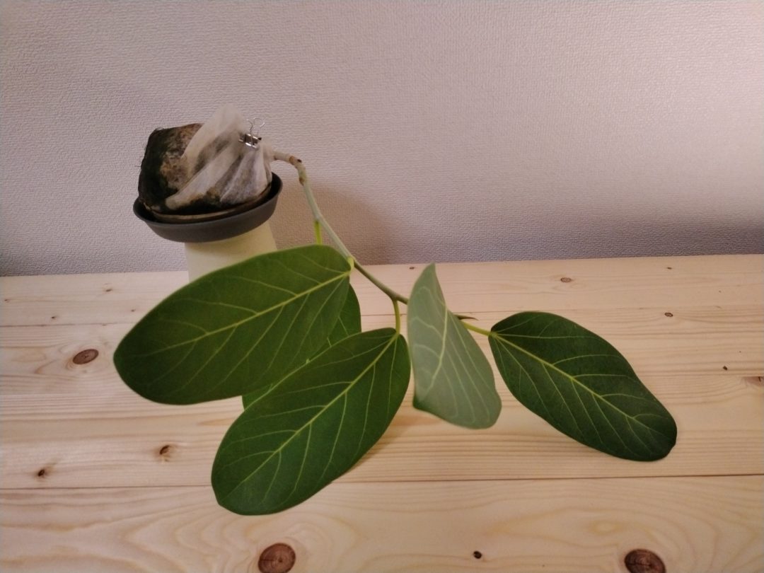 株を180度回転させると、葉っぱがすべて裏面を見せる状態になります。葉の裏表は、わかりにくいため、回転しても写真では伝わりにくいかもですね。鉢植え植物は、時々、鉢を回してあげると、葉っぱが全方向を向いて、見た目のバランスはよくなります。