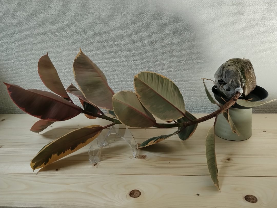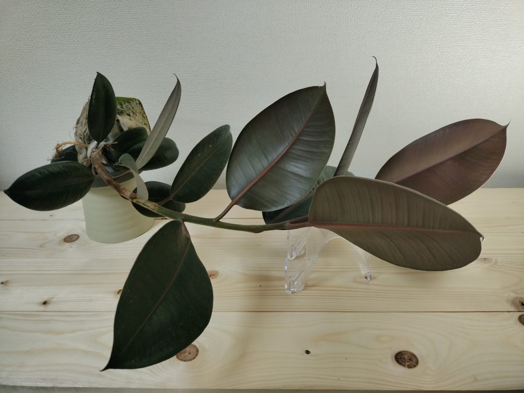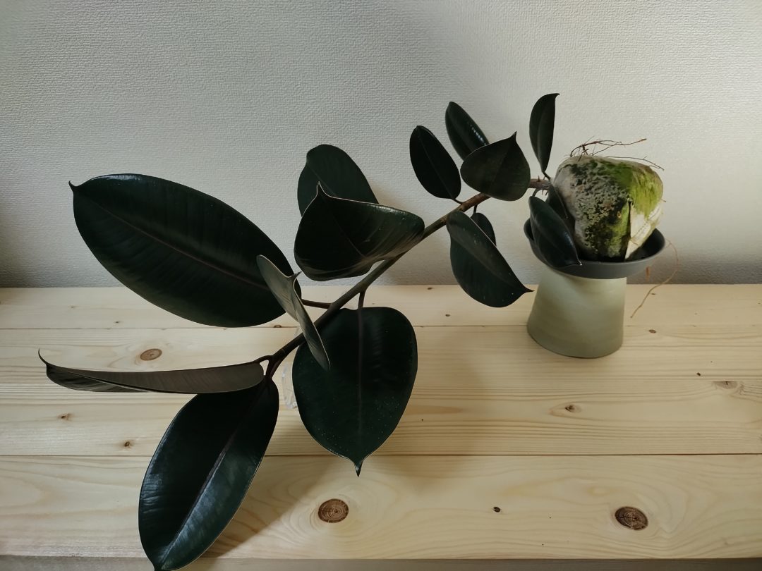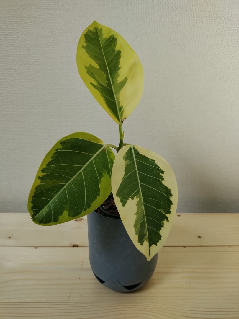 いわゆる「ゴムノキ」で想起する品種。黒くて肉厚の丸いつやつやした葉っぱのアレ。こうやって見ると、若葉は割と細葉なのかもですね。成長の変化も楽しみたいと思います。