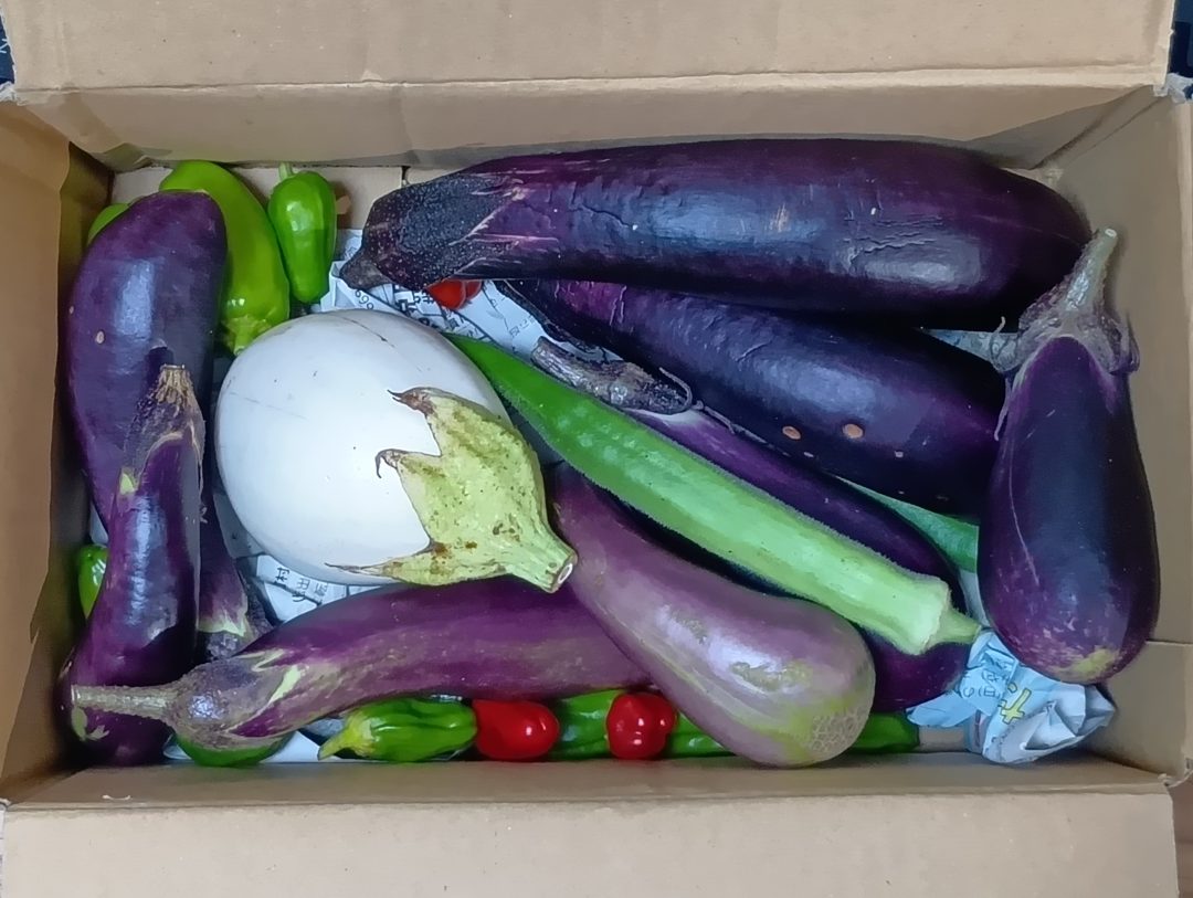 ぼけナス多めのナス科セット(おくらはアオイ科)。箱に入れて、欲しいという方に差し上げました。8月中旬ごろ雨が続いたので、株が挽回して、次回は、いっぱいなってるかなと期待したのですが、以前よりマシになった程度。雑草が勢いよく伸びたおかげもあってか、害虫の目から守られた結果、スリップスやニジュウヤホシテントウなどによるキズものなど、害虫被害が少なめでした。畑のオクラがようやく実をつけはじめました。まもなくやってくるはずの台風で、少しは降雨が期待でき、収穫に好影響を与えそうです。