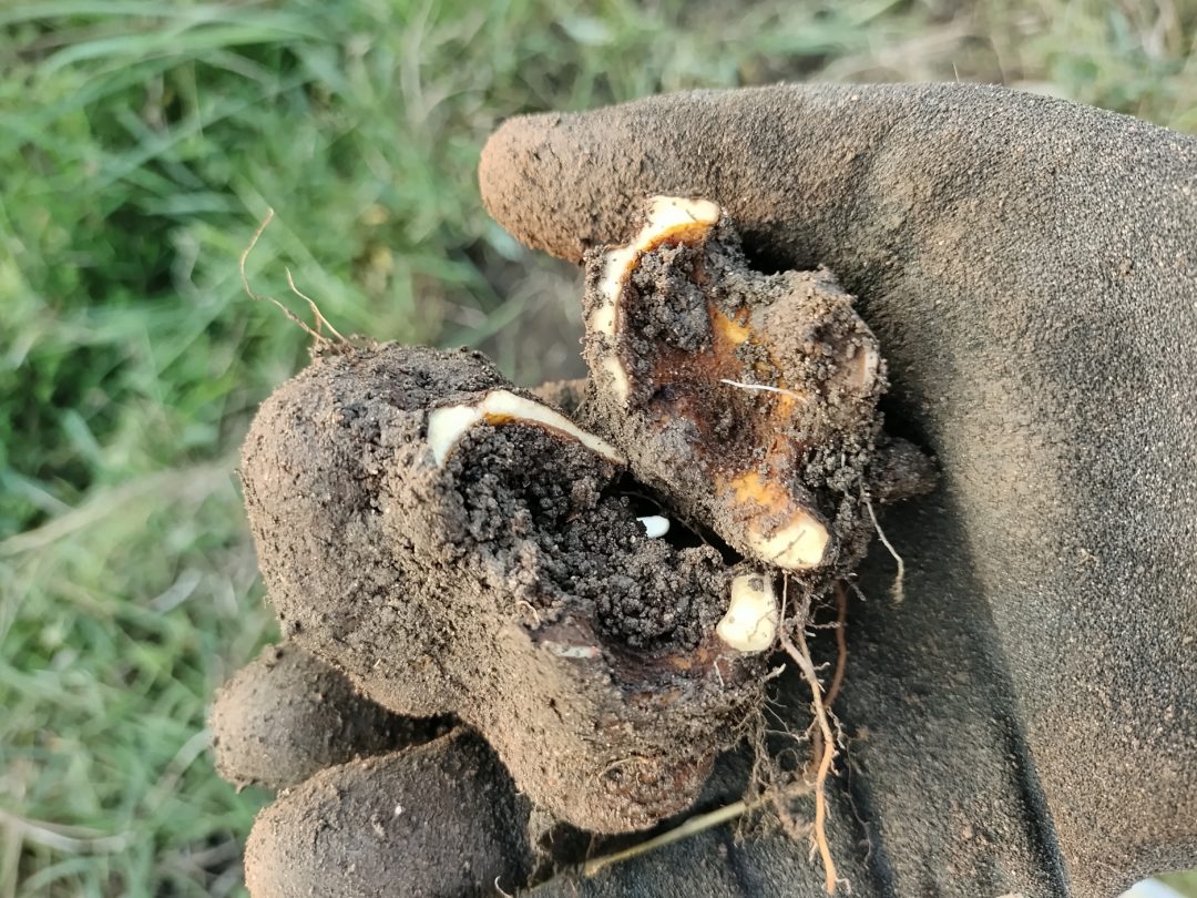 収穫がいつになるかはよくわかってなかったですが、今日、確認すると、すでにつるが枯れていたので、恐らく収穫時期を迎えたとみて、地面を掘ってみたところ、小さな土の塊が。。恐らくこれが芋です。最近、白米をほとんど食べてないので、ごはんを炊いて、芋をすりおろしていただいてみたいと思います。それまで、土がついた状態で、野菜室に保管します。