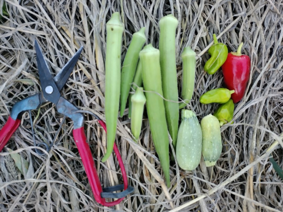 おくらはようやく1.5mほどまで成長、気温も下がって徐々に収穫ができるようになってきました。土づくりをせずに、ただタネを硬い土にまいたことと、水を一切与えなかったことで、なかなか収穫にまで至らなかった要因。